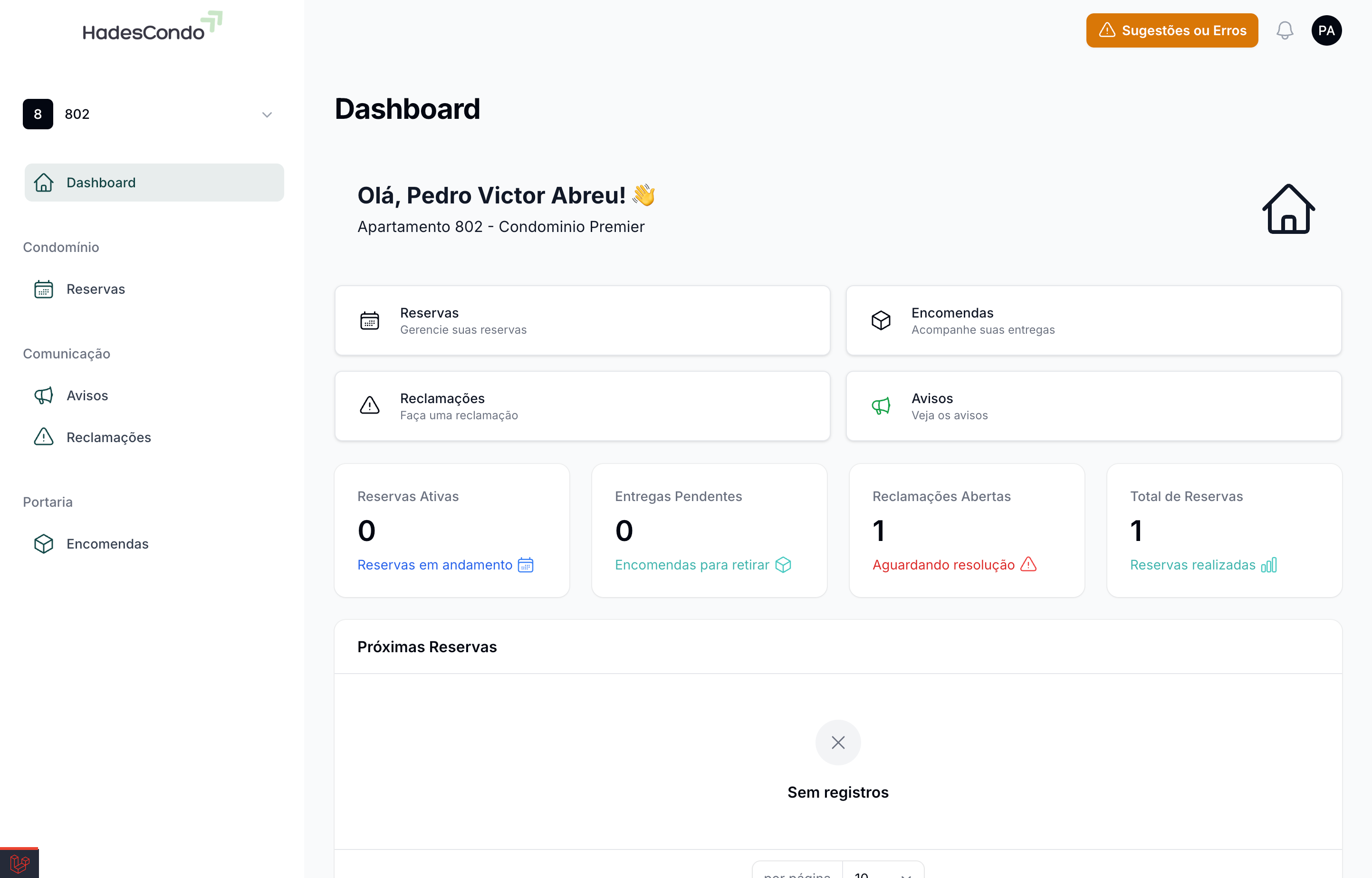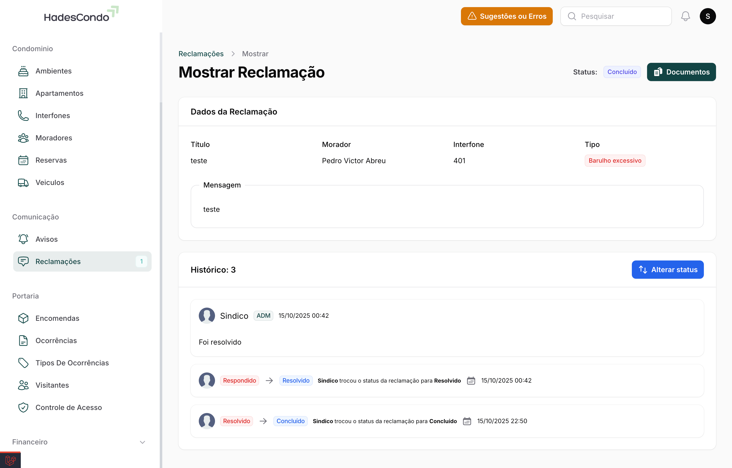 Registro e acompanhamento de reclamações e solicitações dos moradores.